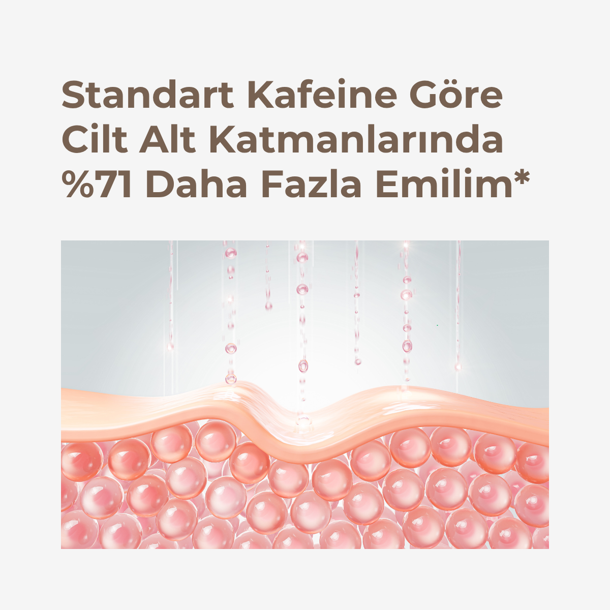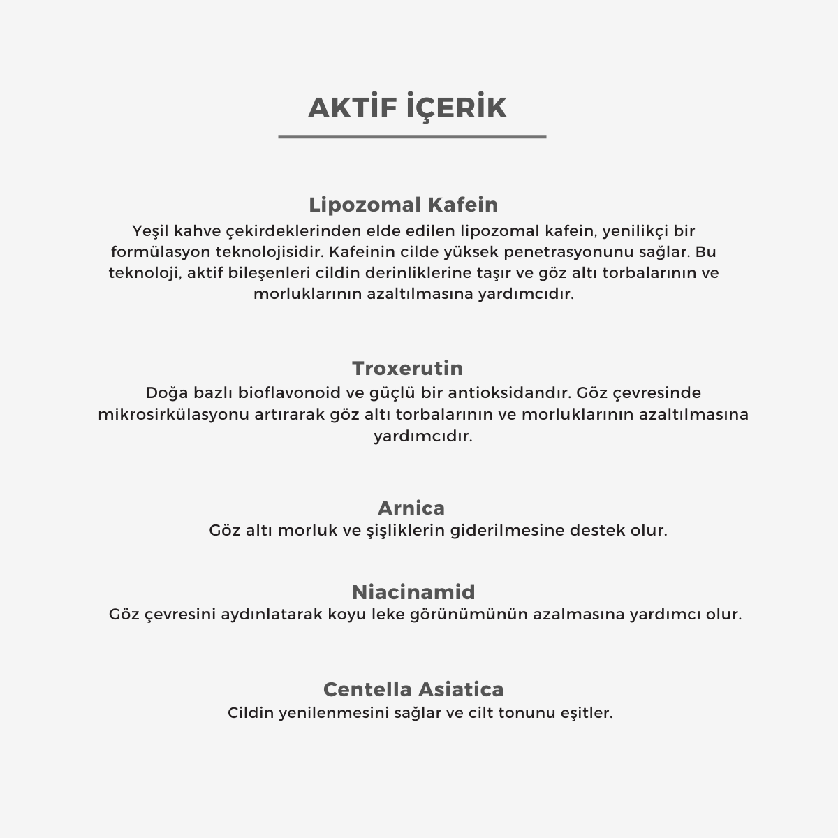 Lipozomal Kafein: Yeşil kahve çekirdeklerinden elde edilen lipozomal kafein, yenilikçi bir formülasyon teknolojisidir. Kafeinin cilde yüksek penetrasyonunu sağlar. Bu teknoloji, aktif bileşenleri cildin derinliklerine taşır ve göz altı torbalarının ve morluklarının azaltılmasına yardımcıdır.