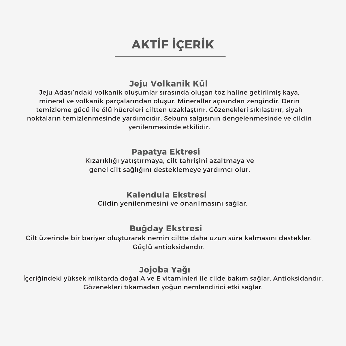 Jeju Volkanik Kül: Jeju Adası'ndaki volkanik oluşumlar sırasında oluşan toz haline getirilmiş kaya, mineral ve volkanik parçalarından oluşur. Mineraller açısından zengindir. Derin temizleme gücü ile ölü hücreleri ciltten uzaklaştırır. Gözenekleri sıkılaştırır, siyah noktaların temizlenmesinde yardımcıdır. Sebum salgısının dengelenmesinde ve cildin yenilenmesinde etkilidir.
