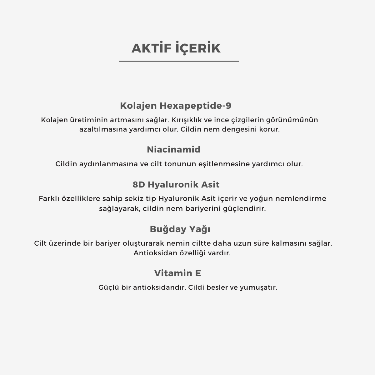 Kolajen Hexapeptide-9: Kolajen üretiminin artmasını sağlar. Kırışıklık ve ince çizgilerin görünümünün azaltılmasına yardımcı olur. Cildin nem dengesini korur.