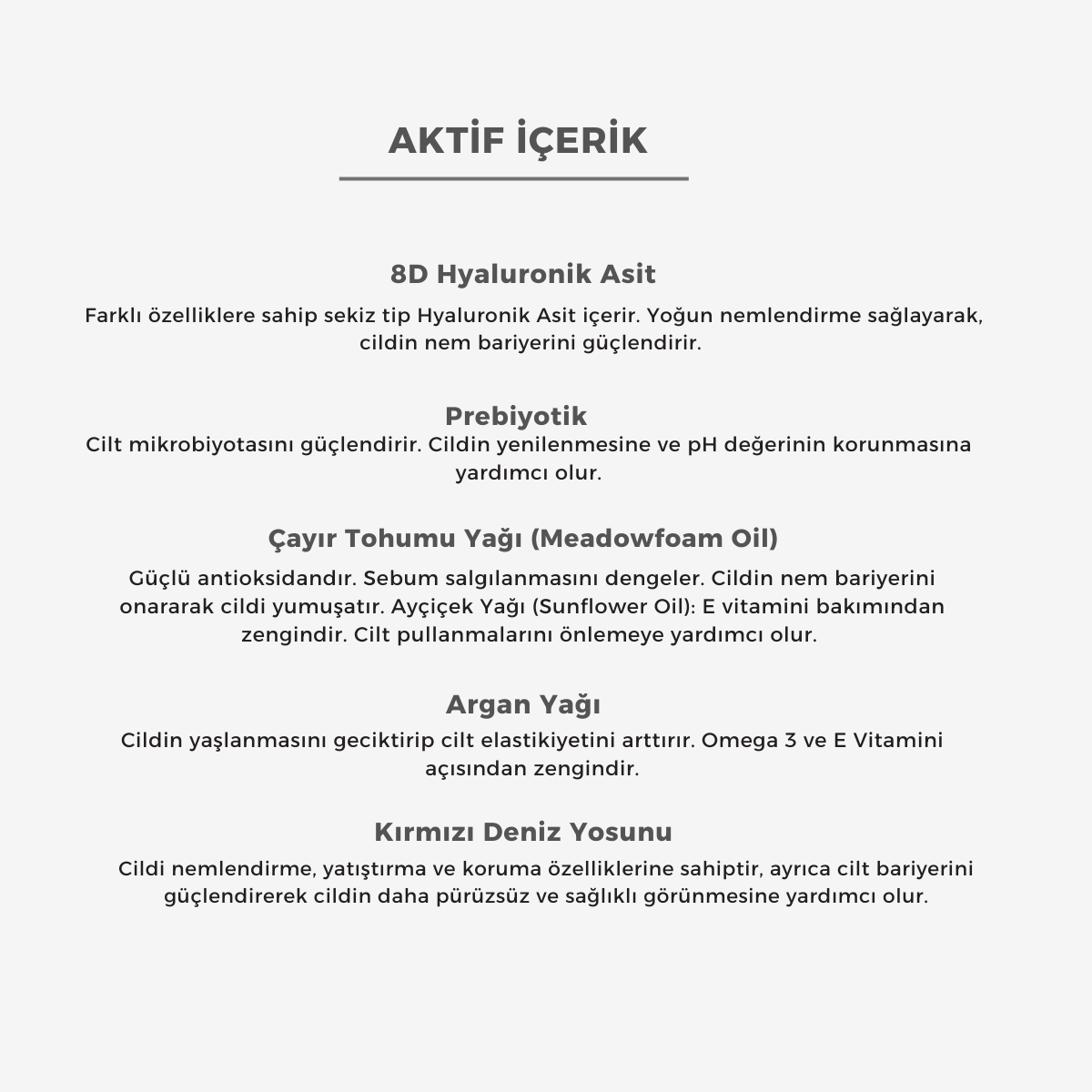 8D Hyaluronik Asit: Farklı özelliklere sahip sekiz tip Hyaluronik Asit içerir. Yoğun nemlendirme sağlayarak, cildin nem bariyerini güçlendirir.